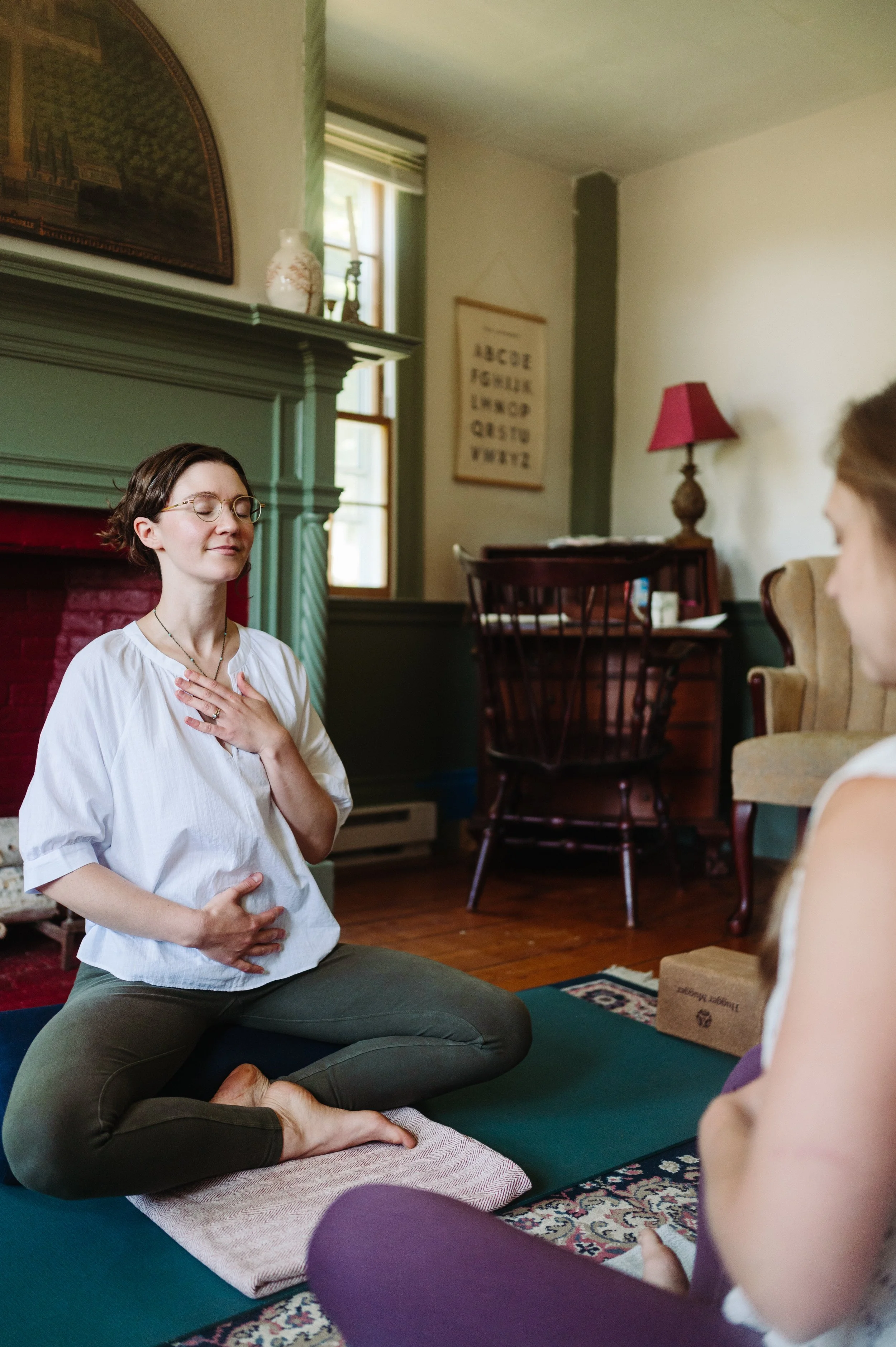My prenatal and postpartum yoga classes offer a supportive space for you to unfold along the path of parenthood. These practices help you navigate this new terrain while feeling seen and heard. Together, we awaken strength with mindful movement and make room for restorative moments of stillness.